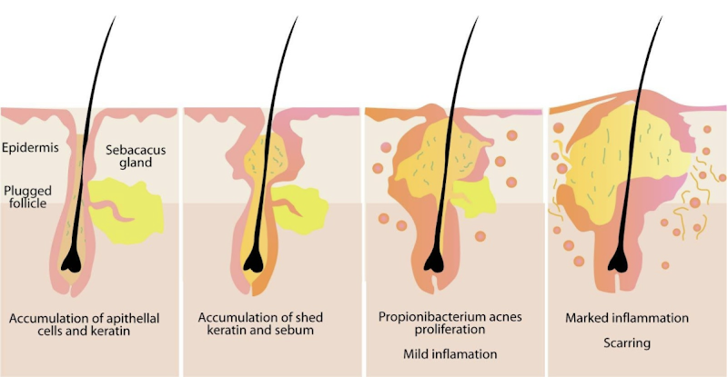 Aknės mechanizme išskiriami šie pagrindiniai ligą nulemiantys procesai: